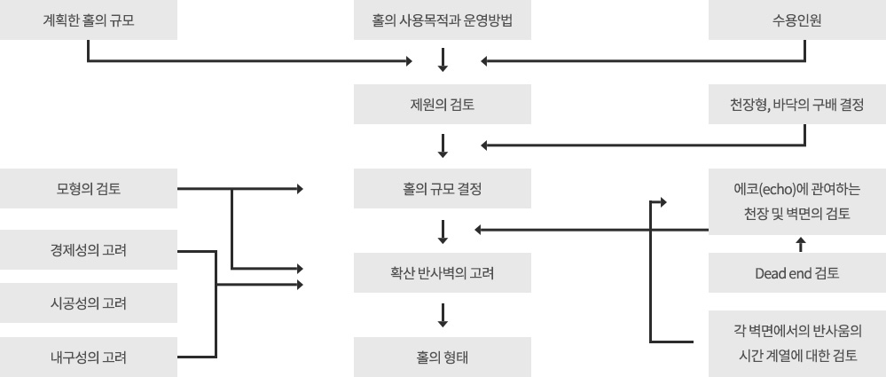 건축음향공간 설계시 용도에 맞는 운영계획, 음향에 대한 설계, 감리, 시공, 성능평가에 이르는 모든 과정을 종합적으로 컨설팅하는 시스템이 있어야만 만족할만한 음환경이 확보될 수 있다.